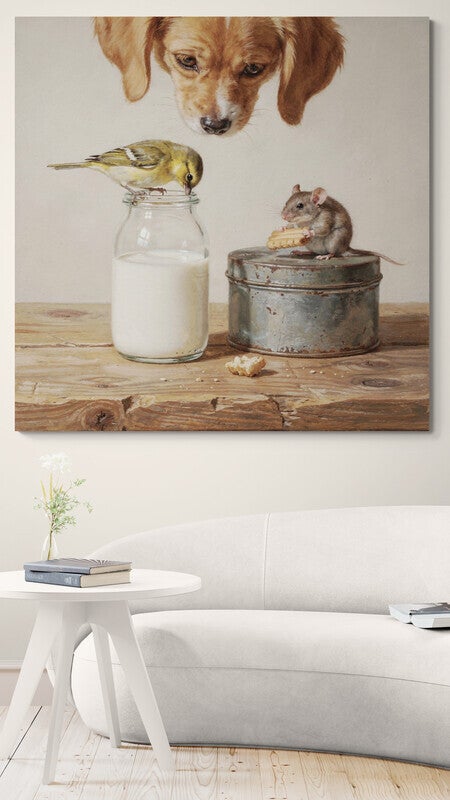 Voorzichtig Gedeeld – schilderij met hond, muis en vogel in landelijke sfeer