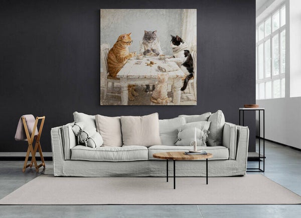 Breng een sfeervol en humoristisch tafereel in huis met dit nostalgische schilderij van een groep katten die een serieus kaartspel spelen. De compositie toont een slimme oranje cyperse kat met een brilletje, een stoere grijze kat in een vest en een elegante zwart-witte kat met een sjaal, allemaal geconcentreerd rond een rustieke witte tafel. Een klein, pluizig kitten kijkt vanaf een krukje toe. De dampende kopjes thee en de stapeltjes munten maken de 'pokeravond' compleet.
