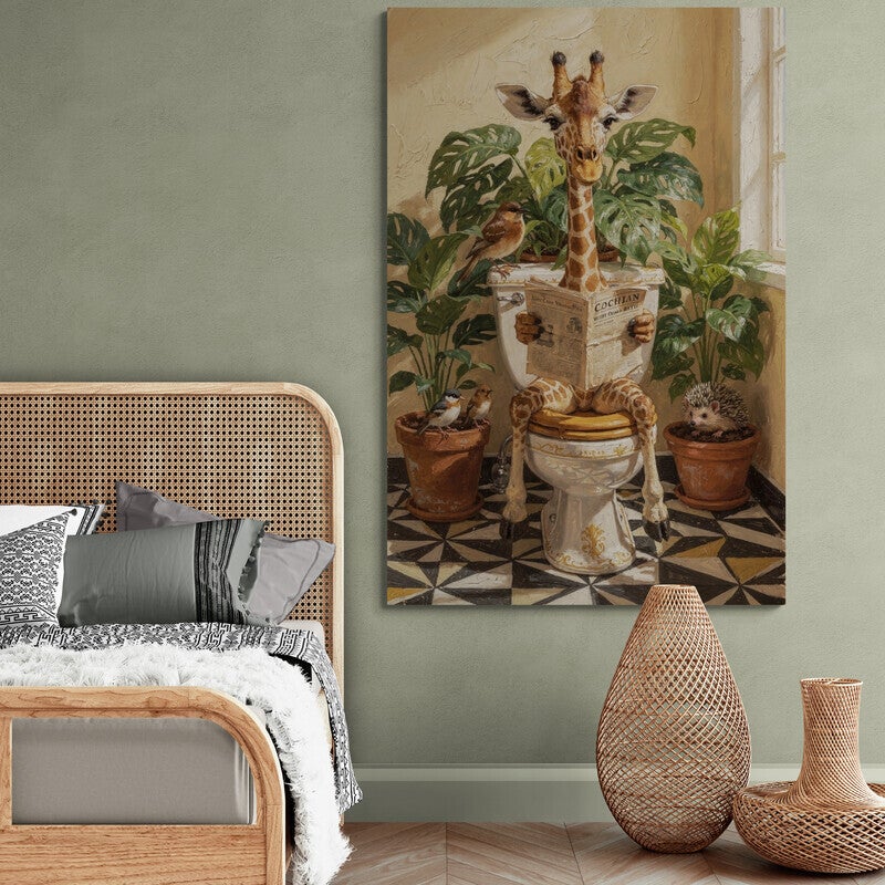 Krant & Kroon toont een statige giraffe die ontspannen op een klassiek toilet zit en een krant leest, omringd door groene kamerplanten en kleine dieren. De combinatie van humor en elegantie geeft het schilderij een opvallend karakter. De rijke penseelstructuur en warme lichtval zorgen voor diepte en een ambachtelijke uitstraling, waardoor dit kunstwerk zowel speels als stijlvol aanvoelt.