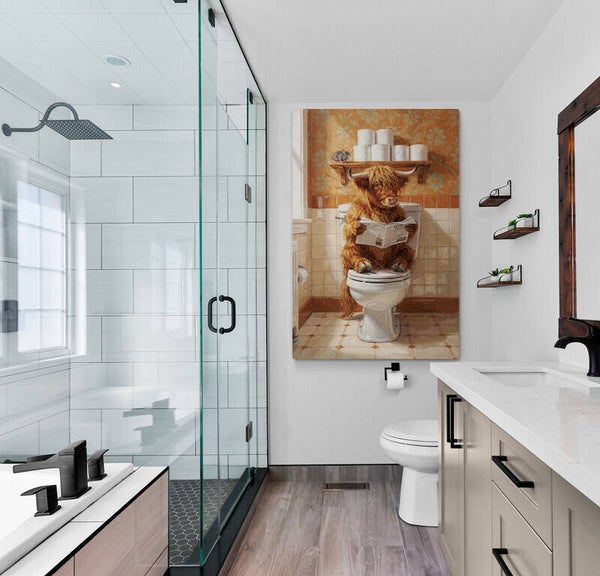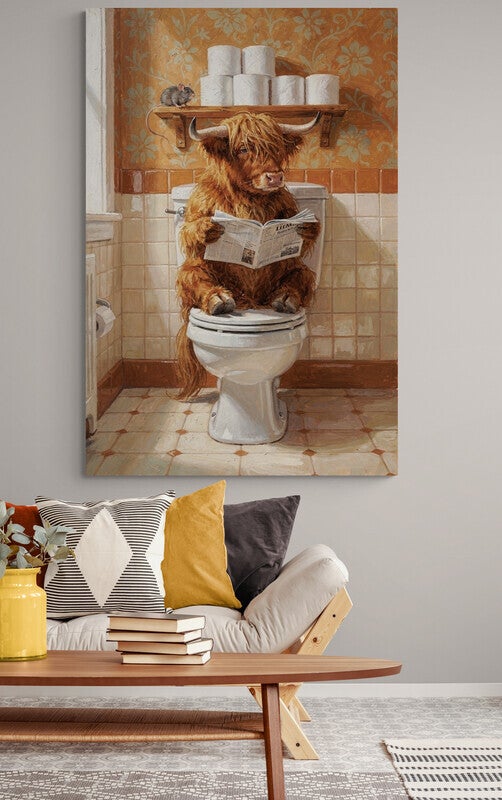 Brutaal & Borstelig – schilderij met Schotse hooglander op toilet