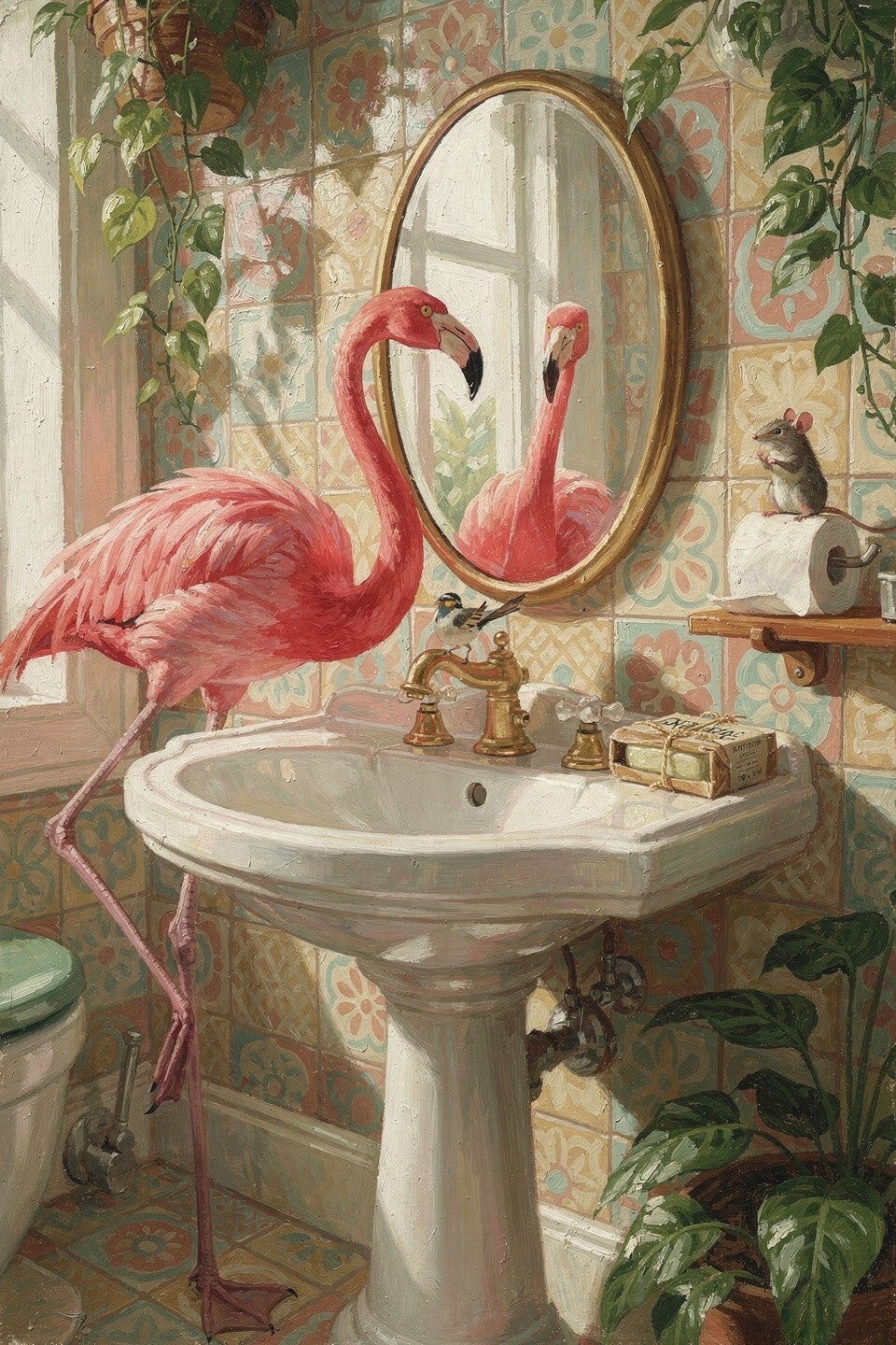 Flamingo bij klassieke wastafel, ronde spiegel met gouden rand, messing kraan, retro wandtegels met bloemmotief, hangplanten, muis op toiletrol, klein vogeltje op de kraan, blok zeep naast de wastafel, zachte lichtinval, zichtbare penseelstructuur