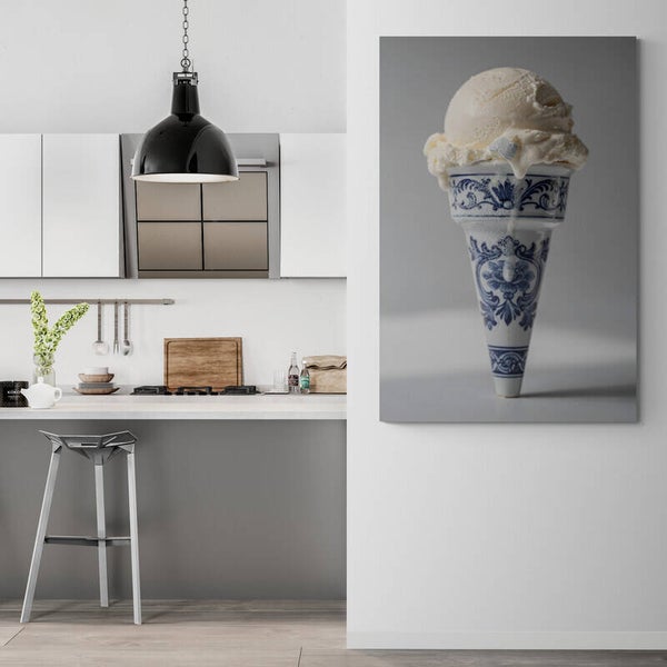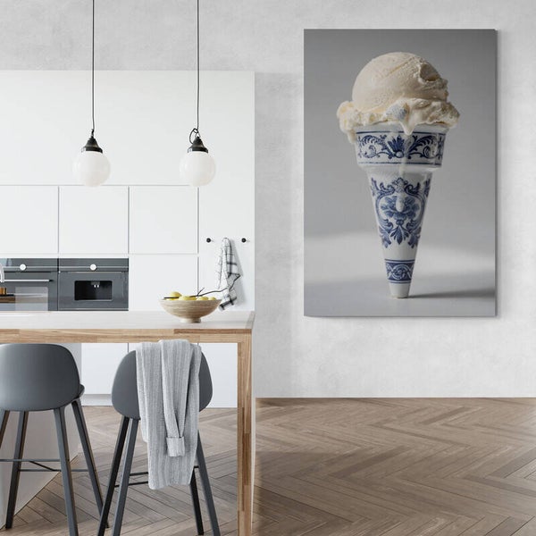 Een verrassend kunstwerk waarin romig vanille-ijs samensmelt met klassiek Delfts blauw porselein. De hoorntjestructuur lijkt van keramiek met subtiele craquelé barstjes, terwijl het ijs zacht begint te smelten over het glanzende oppervlak. Een spel tussen ambacht en humor, traditie en verleiding.