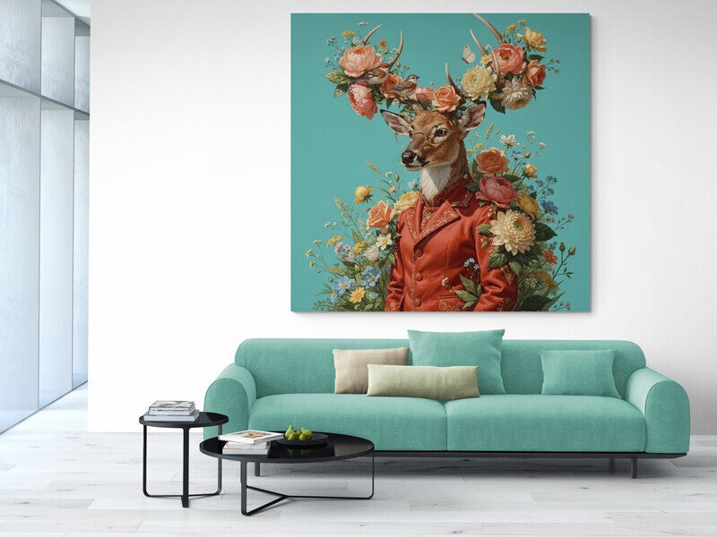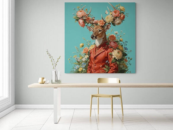 Dit unieke portret combineert klassieke elegantie met een speelse, nostalgische twist. Een statig hert kijkt intelligent de wereld in door een ronde, gouden vintage bril, gekleed in een prachtig gedetailleerd rood jasje met gouden borduursels. Zijn gewei is veranderd in een weelderige bloemenkroon van pioenrozen en dahlia’s in tinten van perzik, zachtgeel en oudroze, waar kleine vogeltjes en een witte vlinder rustig tussen vertoeven.
