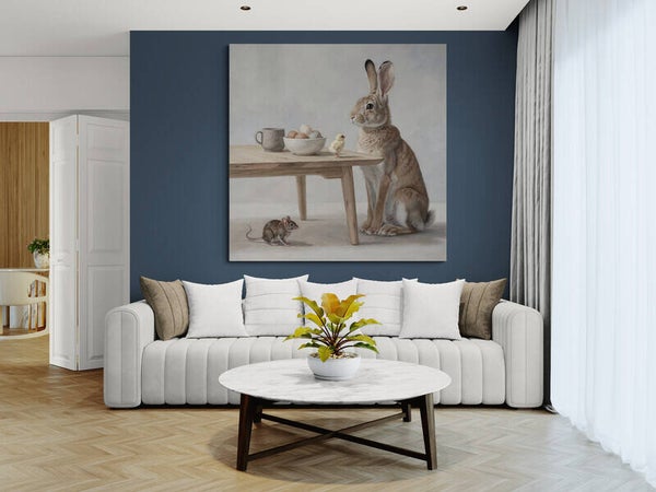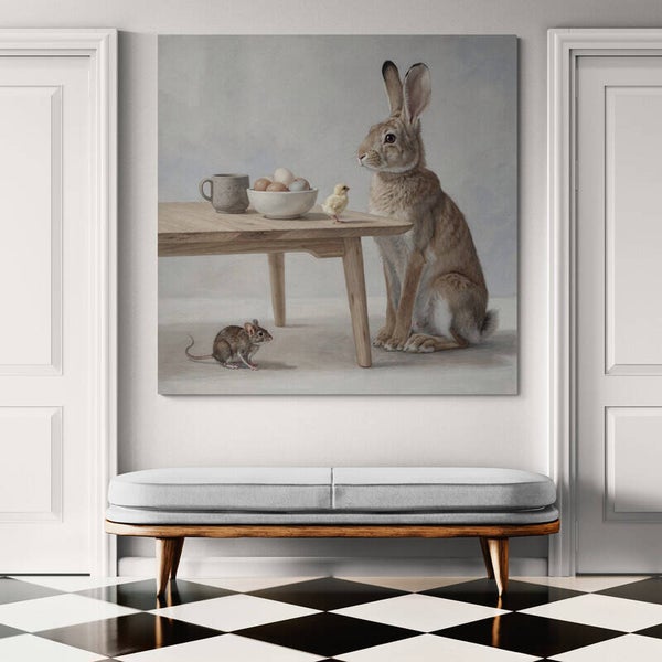 Een serene ontmoeting aan een eenvoudige houten tafel. Een rustige haas kijkt zacht naar een klein kuiken, terwijl een muis nieuwsgierig toekijkt vanaf de vloer. De aardse tinten, matte achtergrond en verfijnde penseelstreken geven dit schilderij een warme, tijdloze uitstraling die doet denken aan klassieke stillevens.