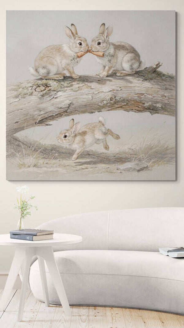 Wortelbelofte – schilderij met hazen op boomstam in landelijke stijl