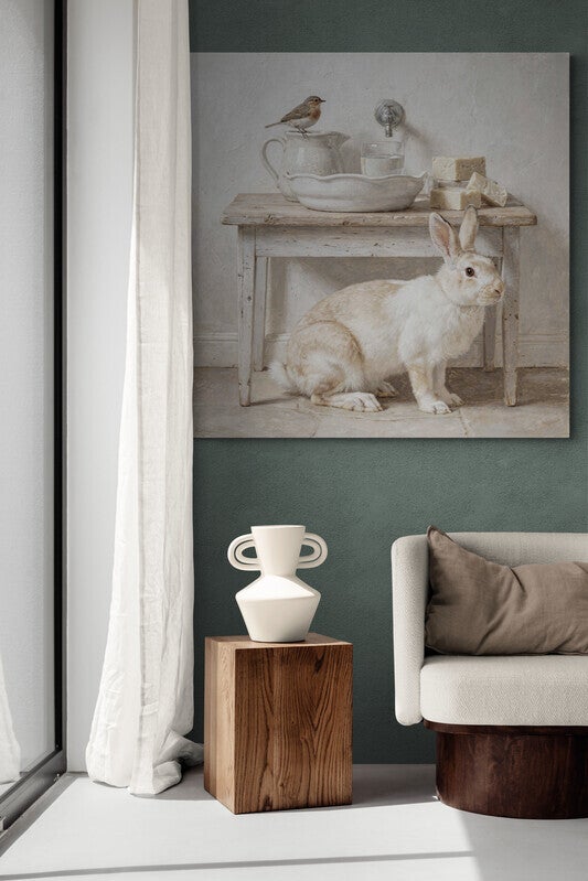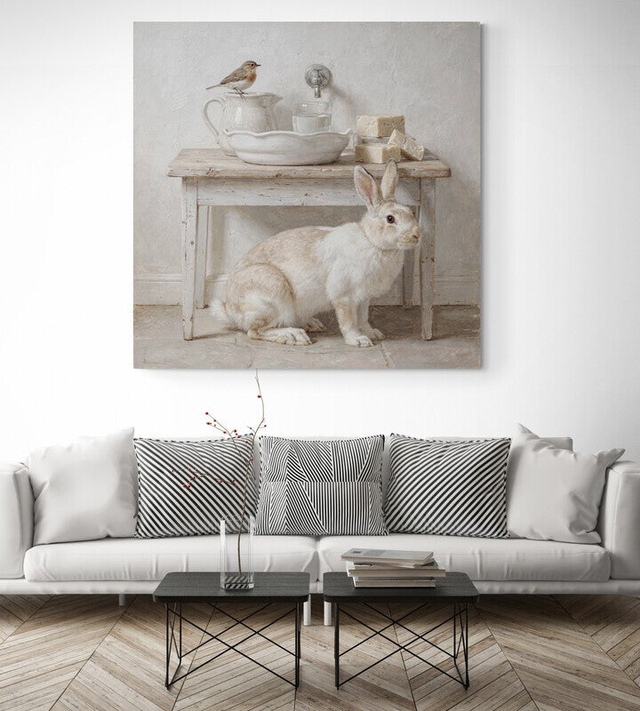 Een verfijnd schilderij in landelijke stijl met een wit konijn, een zangvogel, rustiek houten tafeltje, witte kan en schaal, stukken zeep en een glas water. Perfect voor een landelijke badkamer of rustgevende ruimte. De zachte tinten en brocante sfeer brengen natuurlijke frisheid in elk interieur.