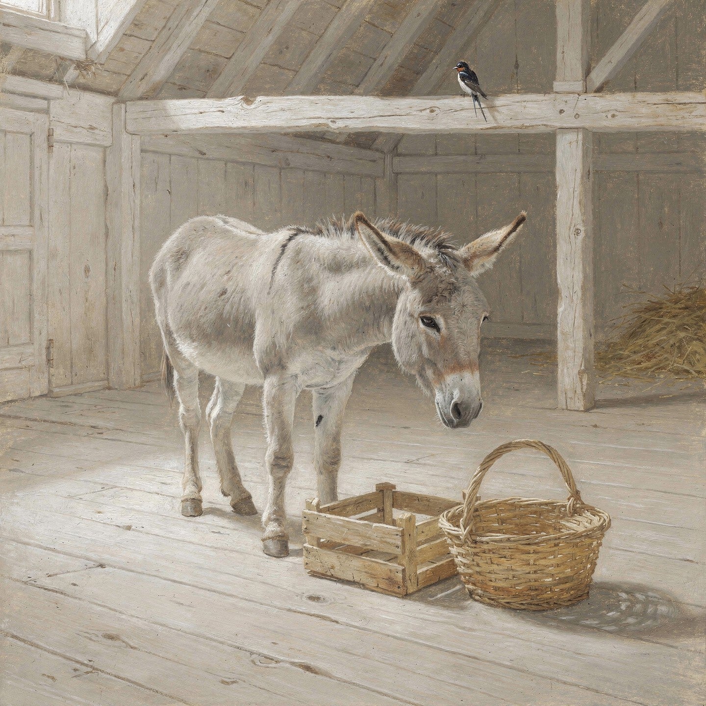 Een vertederend landelijk schilderij van een zachte ezel tussen houten kratten en een rieten mand, omringd door het warme licht van een oude schuur. De zwaluw op de balk boven hem geeft het tafereel een speels accent. Ideaal voor een interieur met rust en charme.