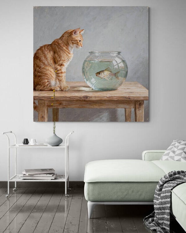 Een verstild moment vol spanning en zachtheid. De aandachtige kat en de goudvis in de glazen kom kijken elkaar zwijgend aan, gevangen in een helder en tijdloos licht. De sobere achtergrond en de natuurlijke houten tafel versterken het gevoel van rust en observatie, waardoor dit schilderij een kalme en karaktervolle aanwezigheid in de ruimte brengt.
