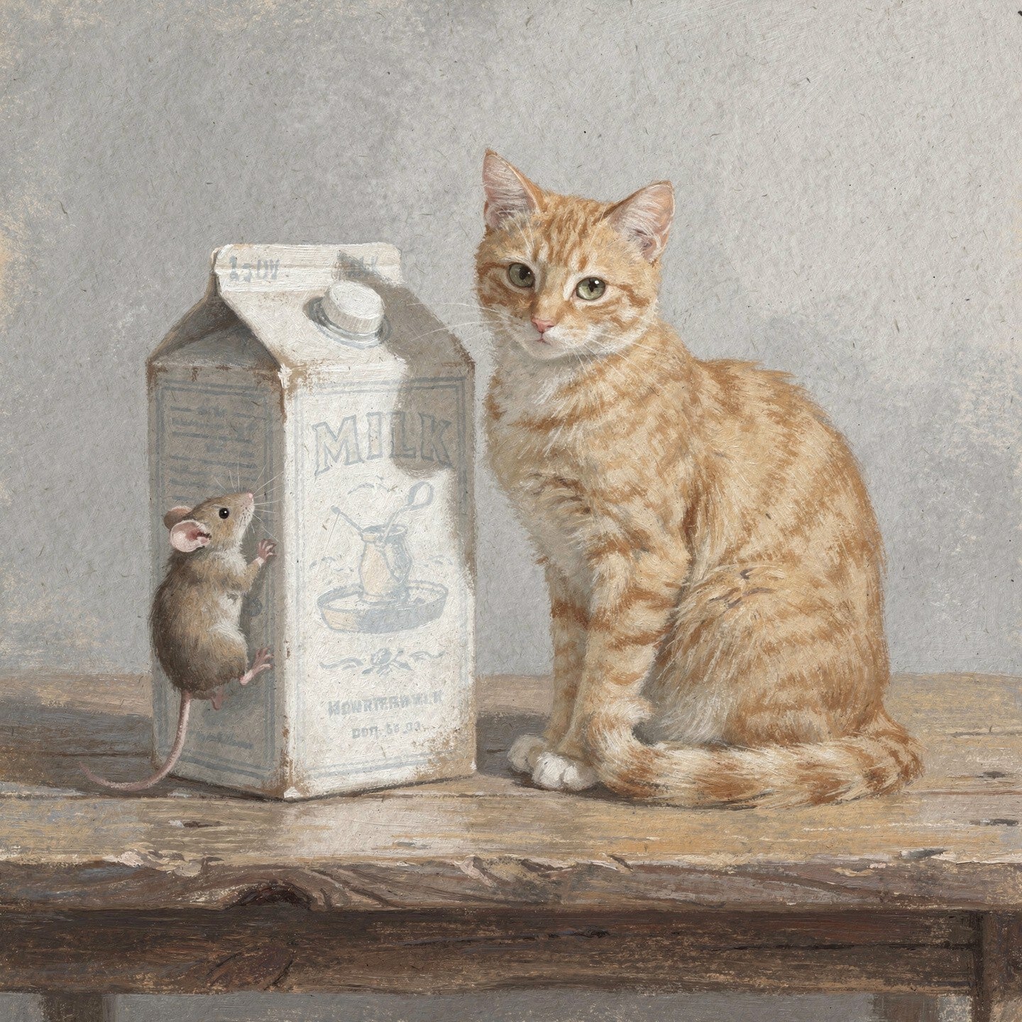 Een rustig en vertederend tafereel waarin een kat waakzaam naast een oud melkpak zit terwijl een kleine muis nieuwsgierig omhoog klimt. De zachte kleuren, het verweerde hout en de eenvoudige compositie zorgen voor een warm en tijdloos beeld. In de stijl van een klassiek geschilderd dierenstuk brengt dit kunstwerk een gevoel van vertrouwde gezelligheid en stille charme in huis.