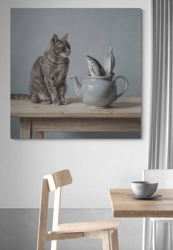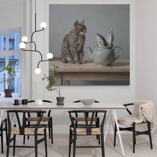 Een verstild en poëtisch tafereel waarin een kat aandachtig kijkt naar een vis die uit een theepot omhoog komt. De zachte grijstinten, het lichte hout en de eenvoudige compositie geven het kunstwerk een kalme en tijdloze uitstraling. In de stijl van een klassiek geschilderd dierenstuk brengt dit schilderij rust, karakter en een subtiel verhalend moment in het interieur.