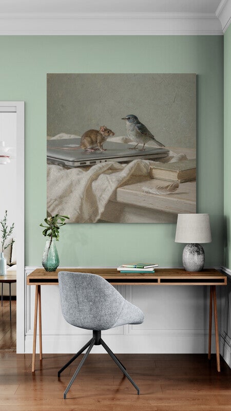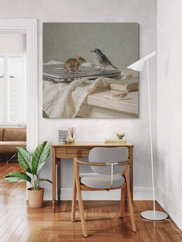 Een stil en poëtisch moment waarin een muis en een klein vogeltje elkaar ontmoeten op een gesloten laptop, omringd door oude boeken, linnen en een veer. Het samenspel van klassieke en moderne elementen geeft het kunstwerk een tijdloze en kunstzinnige uitstraling. In de stijl van een verfijnd geschilderd dierenstuk brengt dit schilderij rust, zachtheid en verwondering in de ruimte.