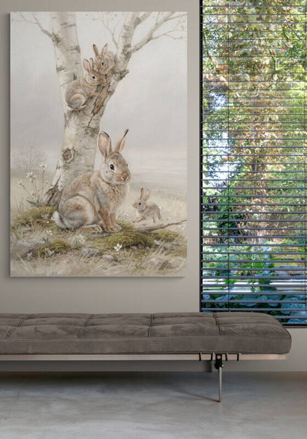 Een teder tafereel waarin een moederkonijn met haar jongen samenkomt onder een lichte berkenboom. De compositie ademt rust en natuur: mos, kleine bloemetjes en het vergrijsde wit van de boomstam zorgen voor een poëtische, bijna Scandinavische landelijke sfeer. De zachte penseelstructuur en de vergrijsde kleuren maken dit werk luchtig, warm en tijdloos.
