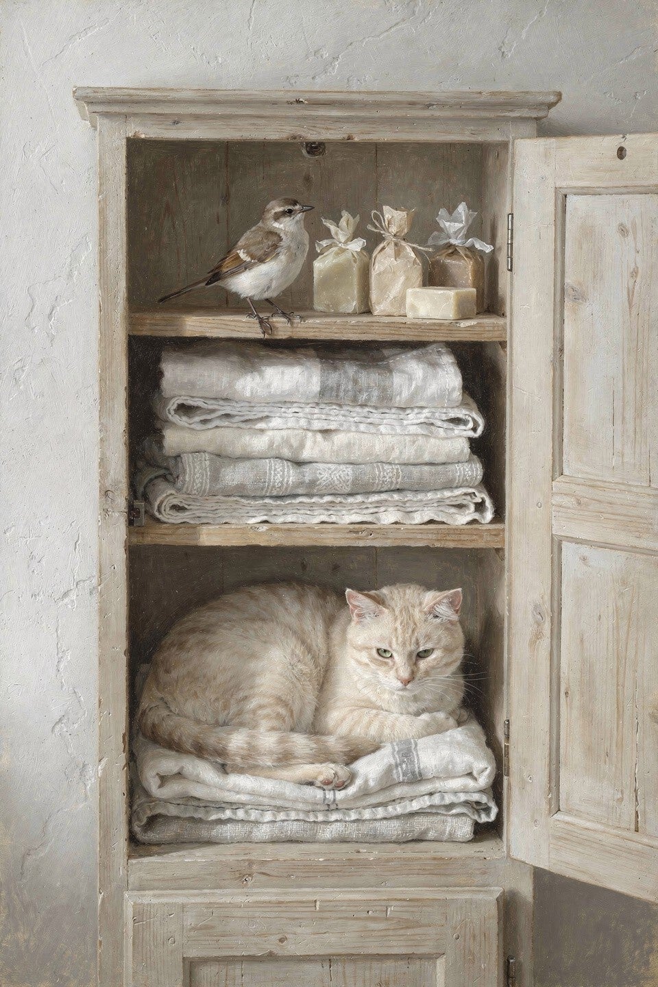 Een verstild tafereel waarin een kat ligt opgevouwen tussen zachte linnen doeken in een oud houten kastje, terwijl boven haar een kleine mus waakt tussen handgemaakte zeepjes. De vergrijsde houttinten, natuurlijke stoffen en het zachte licht geven dit werk een warme, huiselijke sfeer die perfect aansluit bij een landelijke en cottage inrichting.