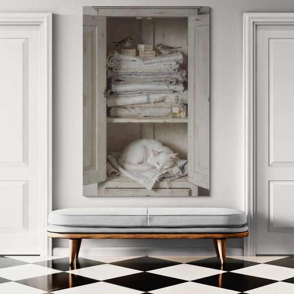 In de stilte van de oude linnenkast heeft de witte kat haar eigen plek gevonden, diep weggezakt in de geur van fris gewassen stoffen. Boven haar houden twee mussen de wacht tussen het opgevouwen linnengoed en kleine stukken zeep, alsof ze fluisterend verhalen uitwisselen over het huis en zijn bewoners. Het zachte licht, de verweerde planken en de tere tinten geven dit werk een gevoel van geborgenheid en tijdloos wonen. Een schilderij dat rust brengt en een interieur vult met warmte en nostalgie.