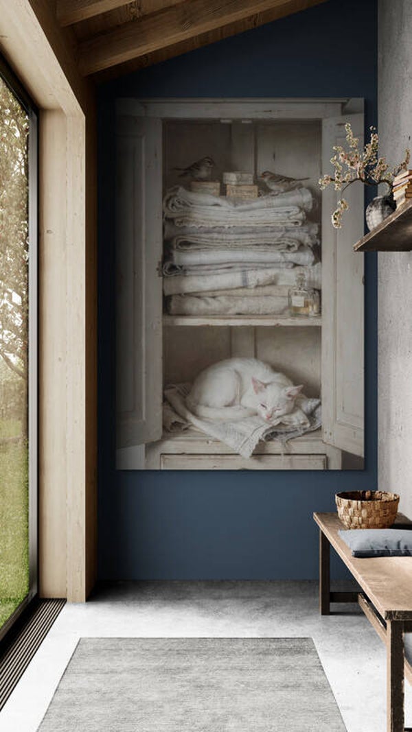 Het linnenkastgeheim – schilderij met slapende kat en mussen in landelijke woonstijl