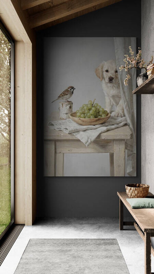 Voorzichtig schuift het gordijn opzij en daar verschijnt een nieuwsgierige puppy, alsof hij net heeft ontdekt dat er iets lekkers op tafel staat. De mus blijft rustig zitten op het houten blokje en bewaakt de schaal met druiven, terwijl het linnen kleed zacht over het verweerde tafelblad valt. Het tafereel voelt als een stil moment in een oud huis waar licht, textiel en hout samen een sfeer van rust en warmte creëren. Dit schilderij brengt een glimlach en een gevoel van thuiskomen in een landelijk interieur.
