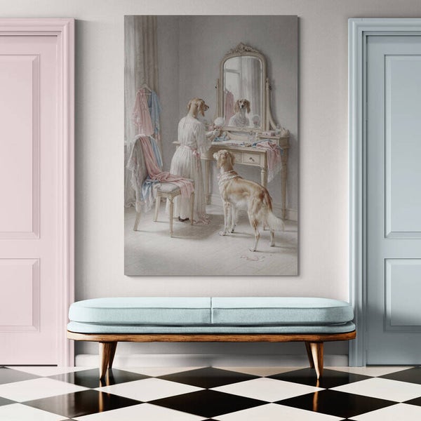 sierlijk kaptafeltje met spiegel, elegante windhond in jurk, tweede hond als stille toeschouwer, parfumflesjes en poederdons, zachte stoffen en linten, subtiele lichtinval, gladde verfijnde schilderstructuur