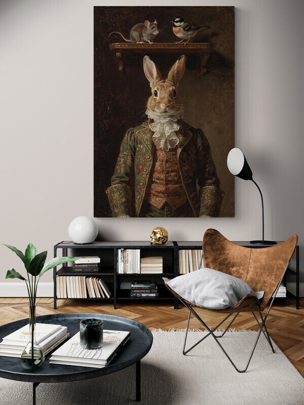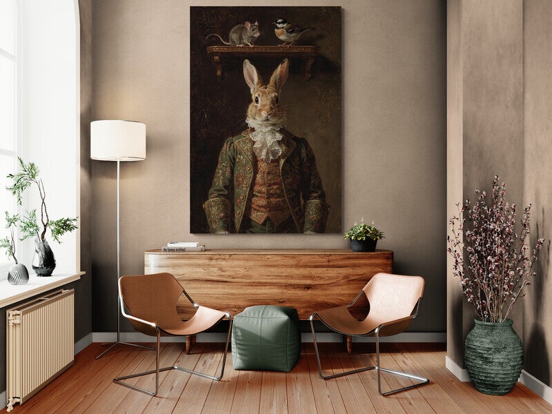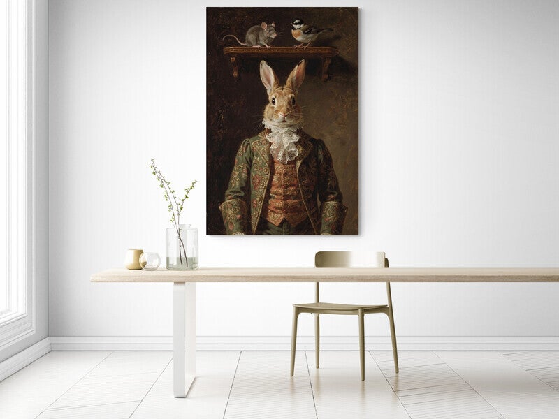 Een statig portret in de sfeer van de oude meesters waarin een elegant gekleed konijn frontaal is afgebeeld tegen een donker, gelaagd achtergrondvlak. De rijke stoffen, het kanten jabot en de warme lichtval zorgen voor een klassiek en tijdloos karakter. Boven het portret versterken de kleine dieren op de console de verhalende, schilderkunstige compositie. De zichtbare verweerde canvasstructuur en de diepe aardetinten geven het werk de uitstraling van een authentiek olieverfschilderij uit een historisch atelier.