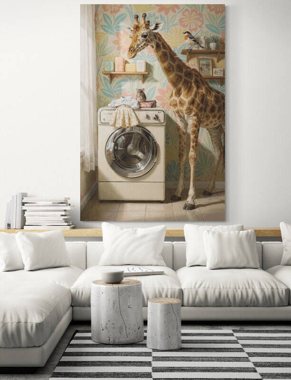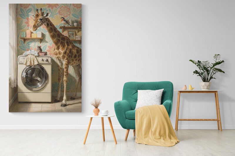 Tussen het kleurrijke bloemenbehang en de zachte ochtendgloed staat de wasmachine rustig te draaien. De giraf buigt nieuwsgierig haar lange nek naar het kleine muisje dat bovenop de warme stapel kleding zit, terwijl de vogel vanaf het plankje alles in stilte bekijkt. Het is een speels moment uit een huis waar zelfs de dagelijkse was verandert in een klein verhaal. De combinatie van retro details, pastelkleuren en dieren maakt dit kunstwerk licht, vrolijk en vol karakter.