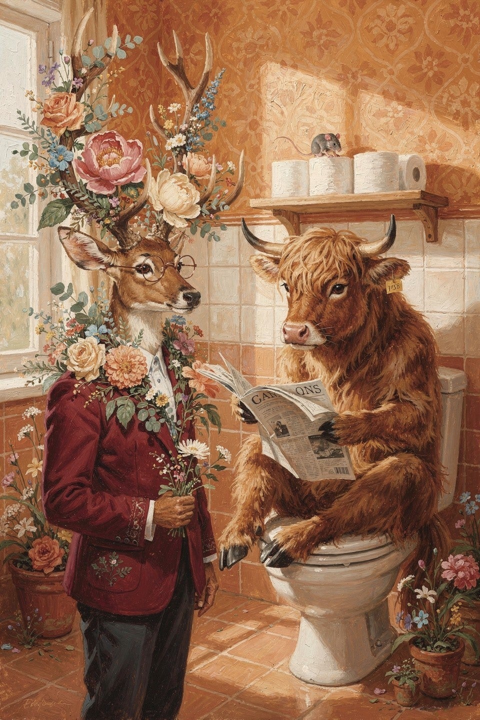 hooglander op toilet met krant, hert in kostuum met bloemen, muis op houten wandplank, rijk bloemenbehang, terracotta vloer, planten in potten, schilderachtige penseelstructuur