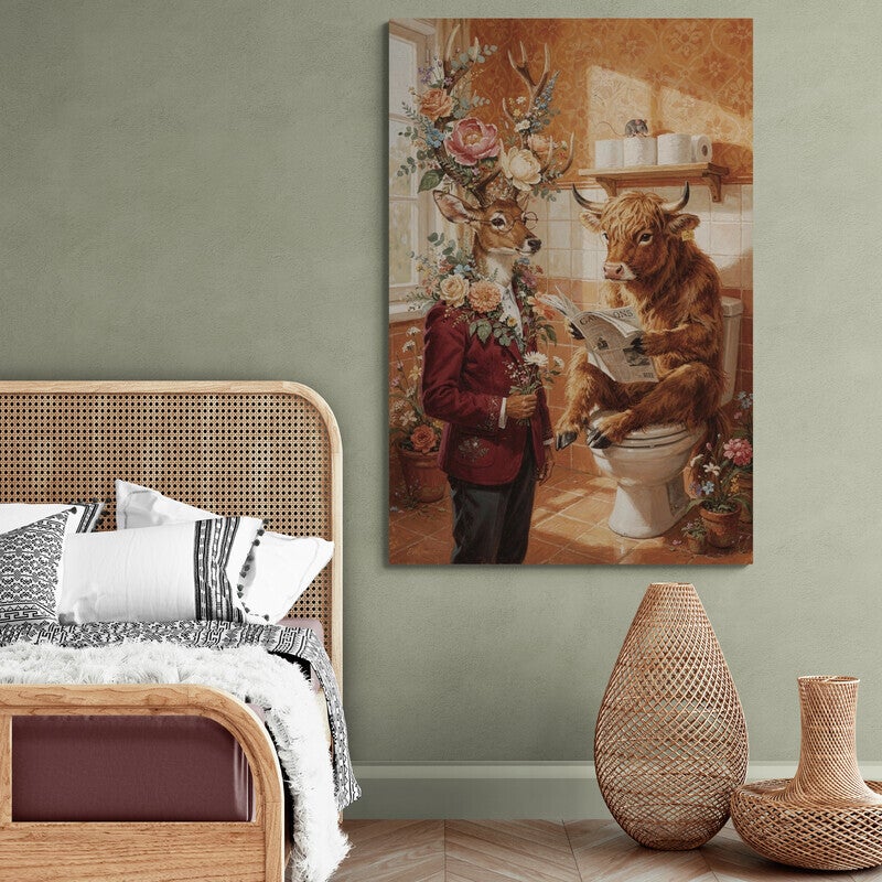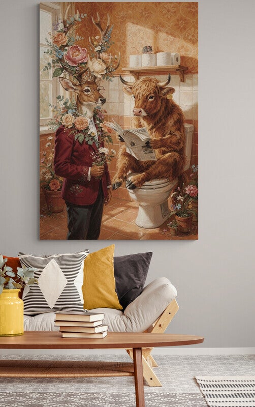 Een dierenschilderij waarin dieren menselijke momenten beleven – zoals een lezende hooglander en een hert met bloemen – brengt direct sfeer en persoonlijkheid in huis. Door de warme kleuren, het bloemrijke behang en de klassieke details past dit kunstwerk perfect in een retro, botanisch of eclectisch interieur.