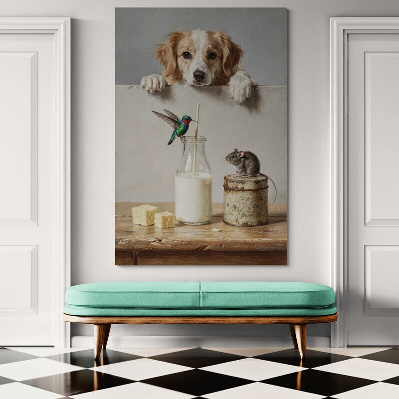 Dit charmante stilleven vertelt een prachtig verhaal van onwaarschijnlijke vriendschap. Een lieve, goudbruine hond kijkt nieuwsgierig over de rand van een tafel naar zijn kleine gasten: een muisje dat parmantig op een vintage blikje zit en een kleurrijke kolibrie die op de rand van een glazen melkfles rust. Op de houten tafel liggen ook twee blokjes kaas, wat het huiselijke en speelse karakter van de scène benadrukt.