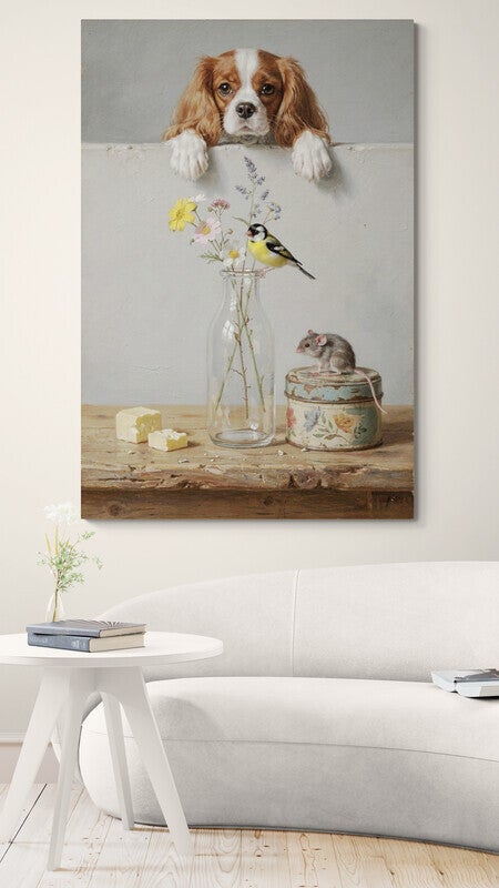 Een verstild tafereel waarin verschillende dieren elkaar ontmoeten rond een eenvoudige glazen vaas met veldbloemen. De nieuwsgierige blik van de hond boven de rand brengt speelsheid, terwijl het kleine vogeltje en de muis zorgen voor een zacht en verrassend detail. De subtiele kleurtinten en de fijne, lichte canvasstructuur versterken de rustige en landelijke sfeer en geven het werk een warme, huiselijke uitstraling.