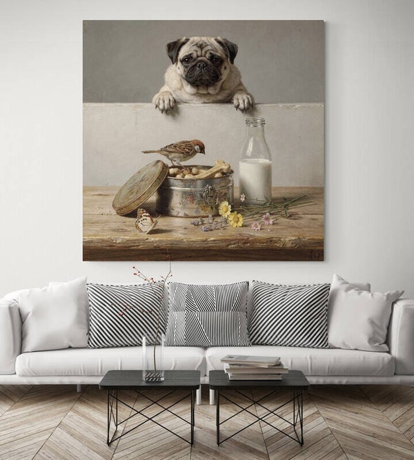 Een warm en charmant tafereel waarin een nieuwsgierige mopshond over de rand meekijkt naar een metalen blik met hondenkoekjes. De mus op de rand, het glazen flesje met melk en de losse veldbloemen zorgen voor een speelse en huiselijke sfeer. De zachte natuurlijke kleuren en de zichtbare schildersstructuur geven dit schilderij een ambachtelijke uitstraling die perfect past in een landelijk en gezellig interieur.