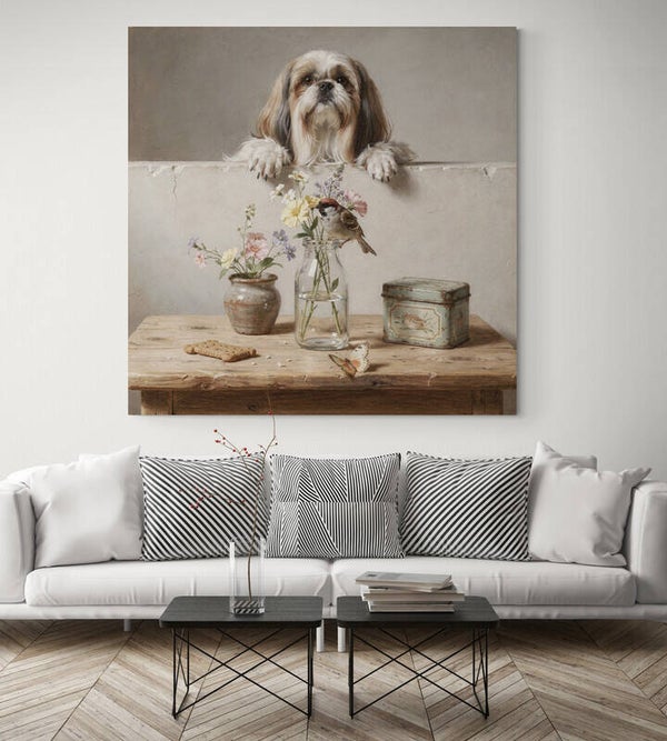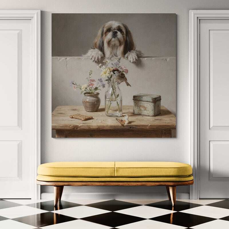 Een zacht en sfeervol tafereel waarin een nieuwsgierige Shih Tzu over de rand meekijkt naar een glazen fles met een boeket veldbloemen. De mus op de rand, het keramieken potje en het vintage blikje zorgen voor een warm en huiselijk geheel. De natuurlijke tinten en de zichtbare schildersstructuur geven dit schilderij een ambachtelijke en landelijke uitstraling die perfect past in een gezellig interieur.