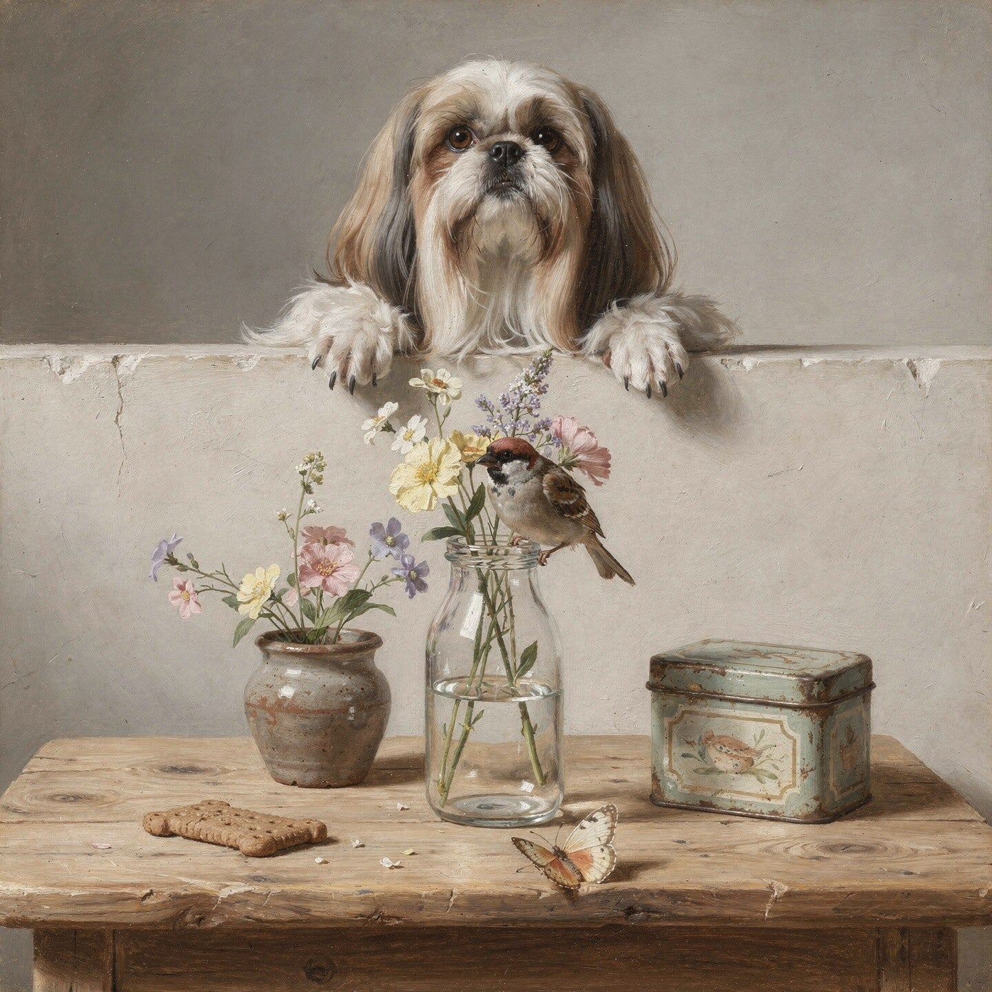 Shih Tzu met lange zijdeachtige vacht en zachte blik over de rand, glazen fles met veldbloemen, mus op de rand van de fles, keramieken potje met bloemen, vintage bewaarblik met illustratie, hondenkoekje op houten tafel, vlinder als verfijnd accent, verfijnde beeldopbouw met zichtbare schildersstructuur