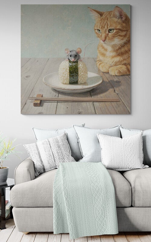 Nieuwsgierig naar sushi – schilderij met muis en rode kat