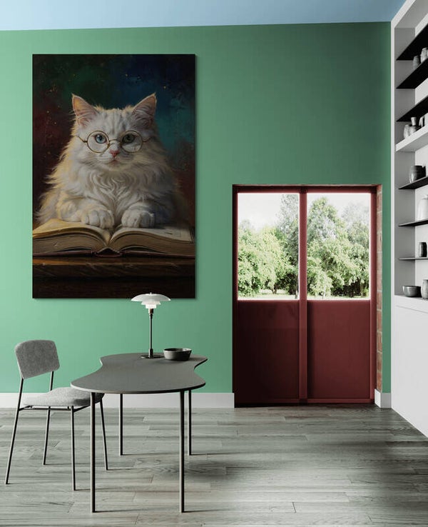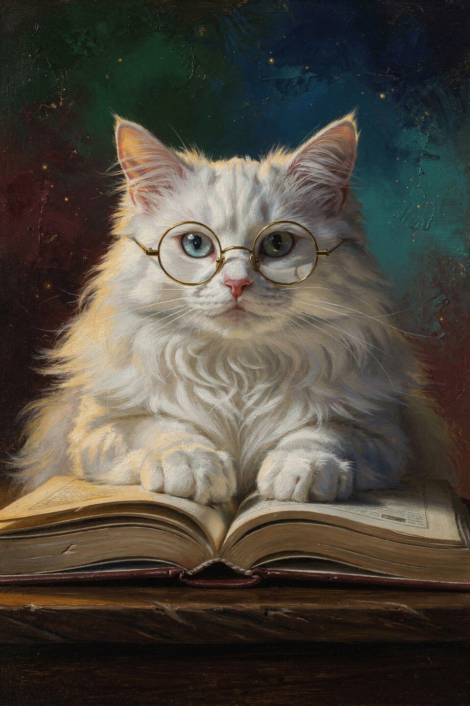 Een elegante witte kat met ronde gouden bril rust met haar pootjes op een open boek alsof ze verdiept is in een bijzonder verhaal. De donkere, rijk gekleurde achtergrond en het warme licht geven dit portret een klassieke en stijlvolle uitstraling. Een kunstwerk dat rust, intelligentie en een vleugje speelsheid uitstraalt.