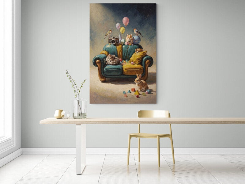 De Droombank – schilderij met dieren op kleurrijke fauteuil in fantasiewereld