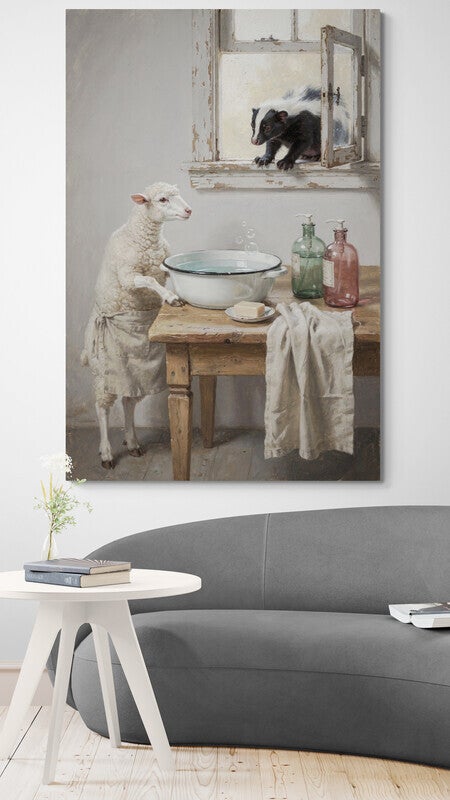 Een aandoenlijk tafereel waarin een lammetje geconcentreerd bij een emaille waskom staat terwijl zeepbellen zacht omhoog dwarrelen. Door het open raam kijkt een nieuwsgierig dasje naar binnen, alsof het moment even wordt gedeeld. De houten tafel, het linnen doek en de glazen flessen geven het schilderij een warme, landelijke sfeer vol zachtheid en verwondering.