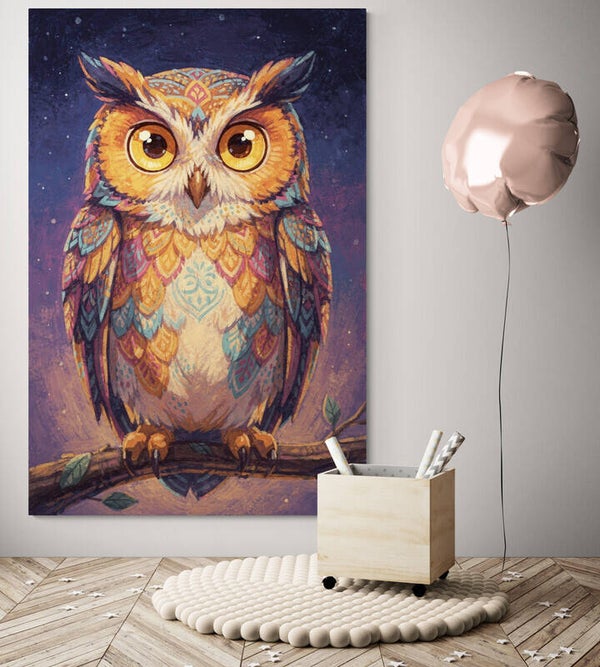 Deze lieve uil met grote warme ogen brengt een gevoel van rust en geborgenheid in de kinderkamer. Perfect voor boven het bedje, bij een leeshoekje of als sfeervolle blikvanger in een bos- of dierenthema kamer.
