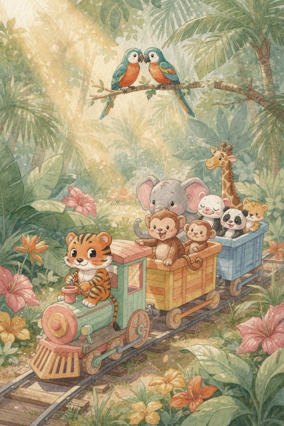 Speelgoedtrein met wagonnetjes, tijger als machinist, aapjes, olifant, giraf, panda, papegaaien op tak, tropische bladeren en bloemen, zonlicht tussen de bomen, fijne schilderstructuur