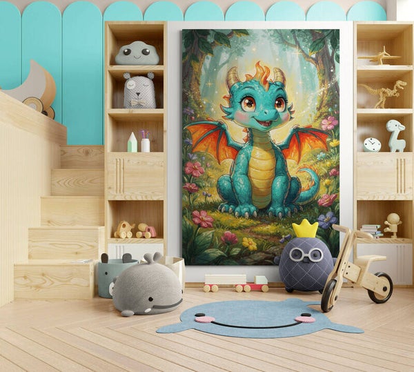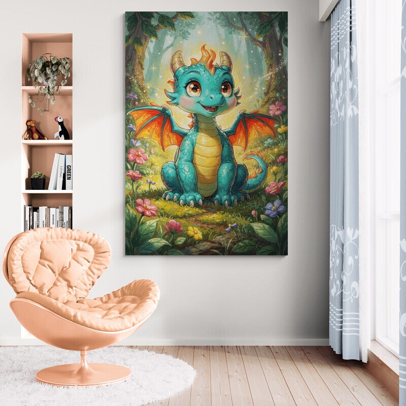 Dit vrolijke draakje met warme kleuren en een magische bosachtergrond brengt direct leven in de kinderkamer. Perfect voor een speelhoek, een fantasiethema kamer of boven het bed van een peuter die houdt van avontuur en sprookjes.