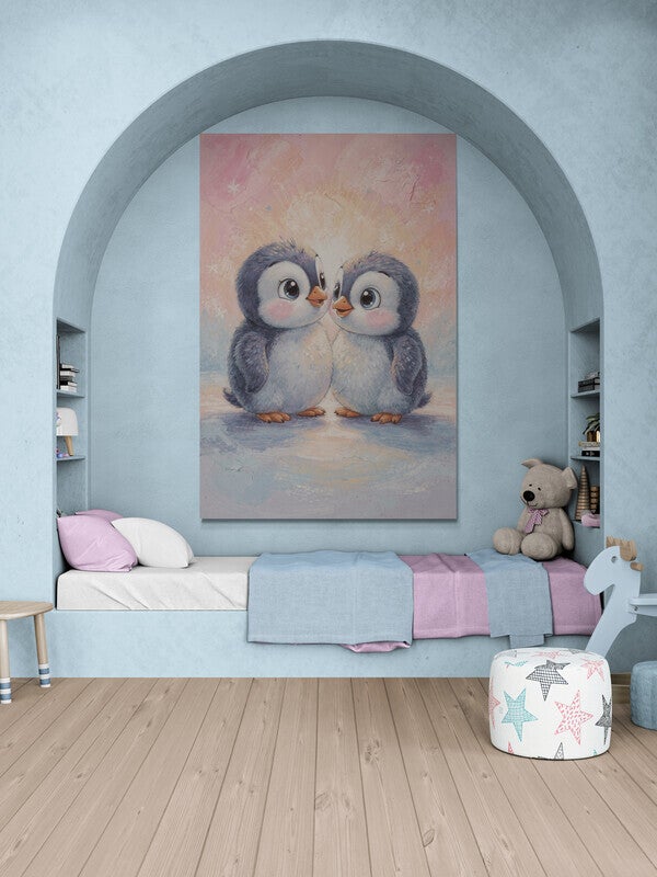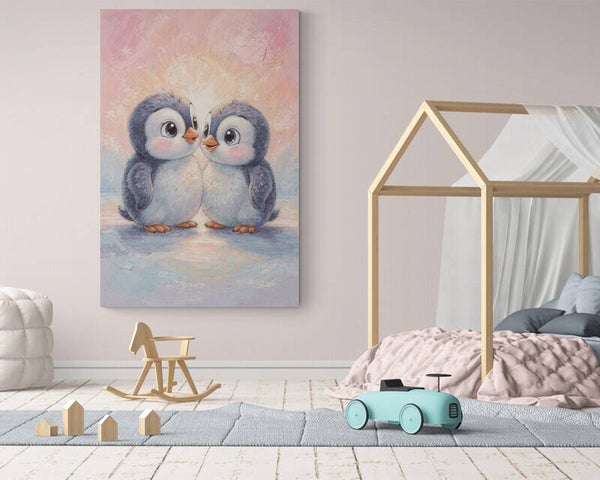 Twee lieve pinguïns staan dicht tegen elkaar aan en brengen een gevoel van warmte en geborgenheid. Dit schilderij past perfect boven een wiegje, in een tweelingkamer of in een rustige babykamer met zachte kleuren.