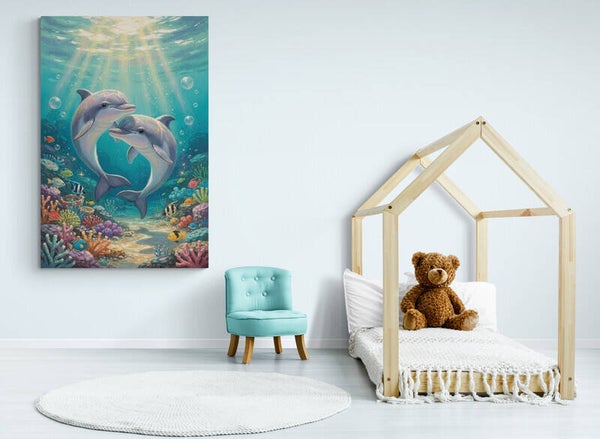 Twee speelse dolfijnen zwemmen samen door een kleurrijke onderwaterwereld vol koraal en visjes. Dit schilderij brengt rust en een dromerige sfeer en is perfect voor boven het bed in een oceaan kinderkamer, zeemeermin kamer of babykamer met zee thema.