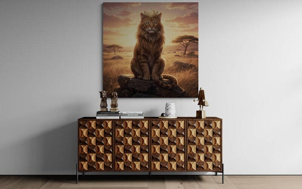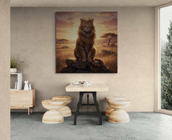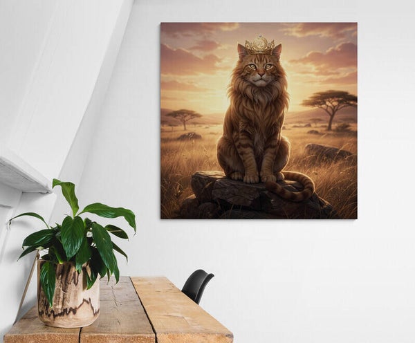 Een krachtig en stijlvol kunstwerk waarin de energie van het sterrenbeeld Leeuw centraal staat. De goudbruine kat met volle manen zit trots op een rots en kijkt uit over de warme Afrikaanse savanne. De subtiele kroon met het astrologische symbool van Leeuw benadrukt zijn rol als leider. De gouden zonnestralen en het open landschap geven dit werk een rustige maar indrukwekkende uitstraling.