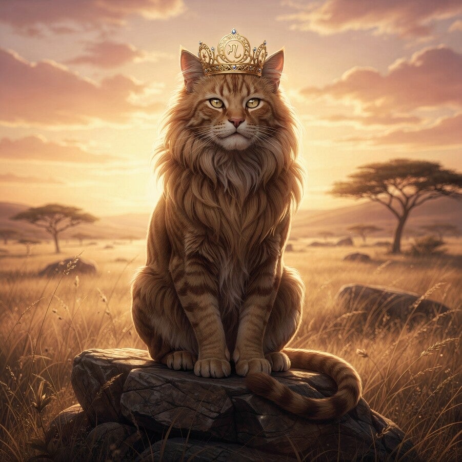 leeuwachtige manen, elegante kroon met astrologisch symbool, savanne landschap, rotsformatie, gouden licht, krachtige houding, symmetrische en rustige compositie