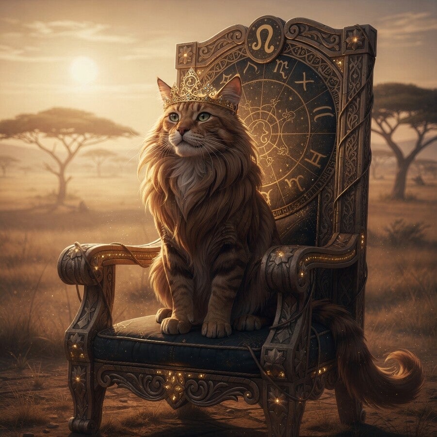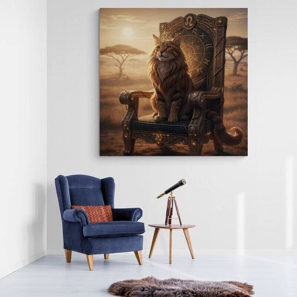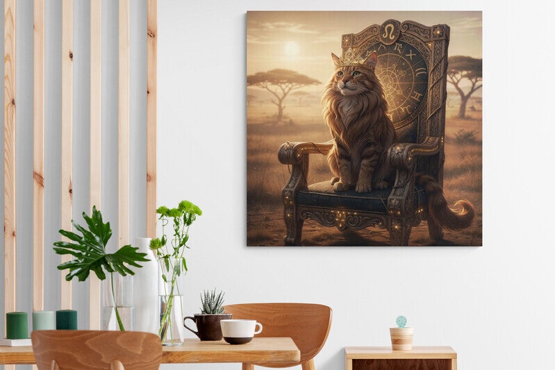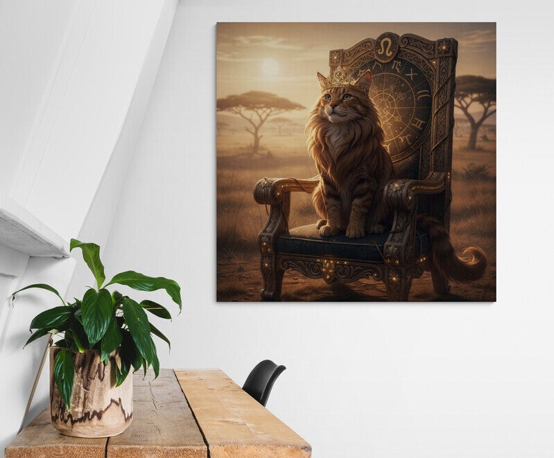 Een indrukwekkend kunstwerk waarin de kracht en uitstraling van het sterrenbeeld Leeuw centraal staan. De goudbruine kat met volle, leeuwachtige manen zit trots op een rijk versierde troon waarin astrologische symbolen zijn verwerkt. De subtiele kroon met het teken van Leeuw benadrukt zijn rol als geboren leider. Het warme savannelandschap en de gouden zonnestralen zorgen voor een rustige, luxe en bijna spirituele sfeer. Een echte blikvanger voor een interieur met karakter.