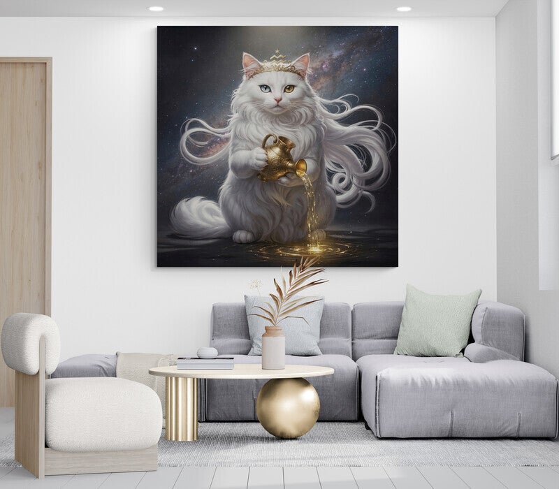 Dit kunstwerk laat het sterrenbeeld Waterman zien als een elegante witte langharige kat in een kosmische wereld vol sterren en nevels. In haar poten houdt ze een sierlijke gouden kruik waaruit een stroom water met een warme gouden gloed naar beneden vloeit. Haar lange vacht beweegt zacht alsof er een lichte wind doorheen gaat en de verfijnde gouden tiara met het Waterman symbool benadrukt haar spirituele en koninklijke uitstraling. De verschillende oogkleuren geven het beeld een extra mystieke kracht en trekken meteen de aandacht. De combinatie van het donkere universum, het cinematografische licht en de gouden accenten zorgt voor een dromerig en luxe kunstwerk dat symbool staat voor vrijheid, intuïtie en vernieuwing.