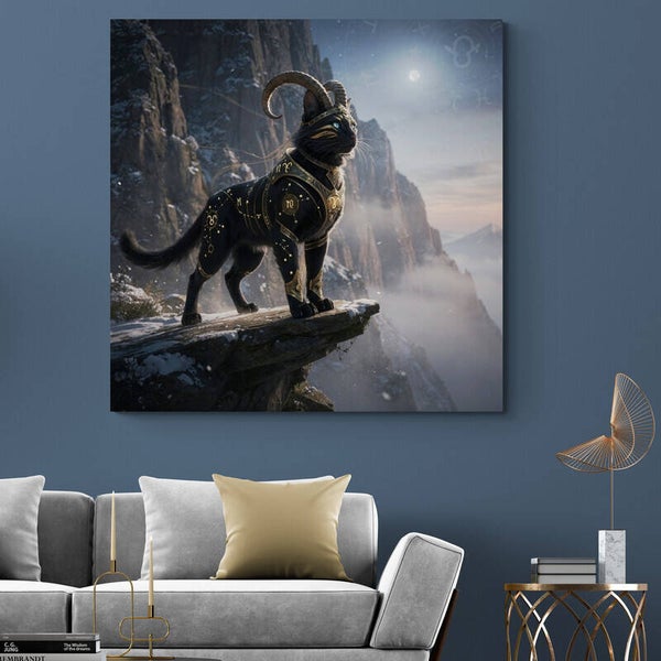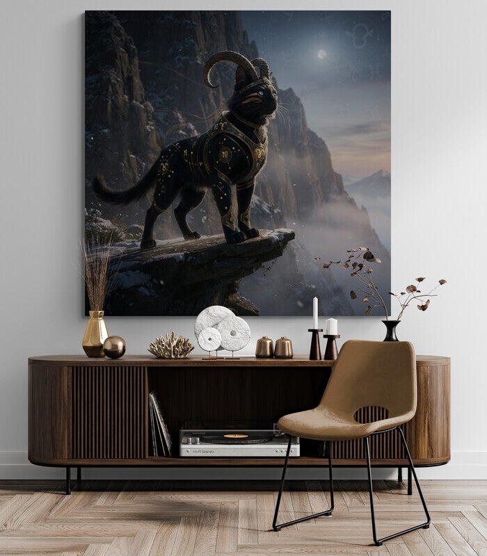 Dit kunstwerk verbeeldt het sterrenbeeld Steenbok als een krachtige zwarte kat die hoog op een bergklif staat en uitkijkt over een mistig berglandschap. Haar houding is trots en vastberaden, alsof ze elk obstakel kan overwinnen. De sierlijke hoorns verwijzen naar het symbool van Steenbok en geven het beeld een mystieke en koninklijke uitstraling. Over haar diepe zwarte vacht lopen verfijnde gouden astrologische patronen die subtiel oplichten in het cinematografische licht. De combinatie van de ruige bergen, de koude lucht en het warme goud zorgt voor een luxe en spirituele sfeer. Dit kunstwerk staat symbool voor doorzettingsvermogen, discipline en innerlijke kracht en is een echte blikvanger in een modern, stijlvol interieur.