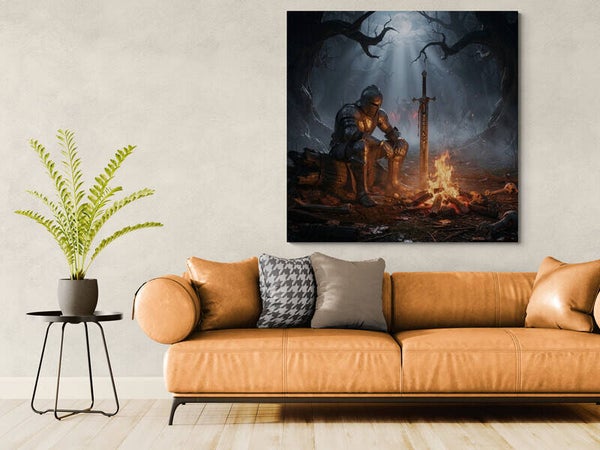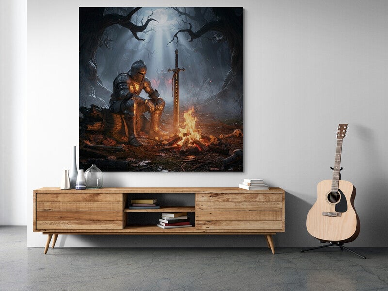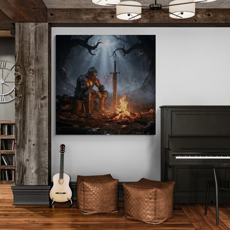 Dit indrukwekkende kunstwerk toont een eenzame middeleeuwse ridder die rust bij een bijna gedoofd kampvuur, diep in een vervloekt bos. Zijn zware harnas is beschadigd en bedekt met as en vuil, wat het gevoel geeft dat hij al een lange strijd achter zich heeft. Naast hem staat zijn enorme zwaard in de grond, waarin donkere runen zacht oplichten. Het koude maanlicht valt door de kale, kronkelende bomen terwijl mist over de bosgrond kruipt. Op de achtergrond verschijnt een dreigende gloed tussen de bomen, alsof er iets nadert. De warme gloed van het vuur tegenover de koele blauwe nachttonen zorgt voor een krachtig contrast en een intense, filmische sfeer. Dit kunstwerk ademt mysterie, doorzettingsvermogen en stilte na de strijd en is een echte blikvanger voor liefhebbers van dark fantasy en epische scènes.