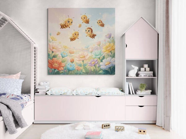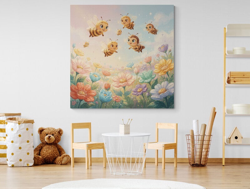 Dit vrolijke kinderkamer schilderij met schattige vliegende bijtjes boven een kleurrijk bloemenveld brengt direct een zachte en dromerige sfeer in de kamer. De speelse compositie met kleine bijtjes in de lucht en een veld vol bloemen zorgt voor een gevoel van vrijheid, natuur en vrolijkheid.