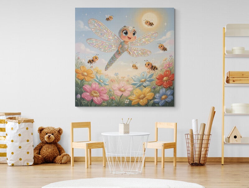 Dit betoverende kinderkamer schilderij met een vrolijke libelle en kleine bijtjes boven een kleurrijk bloemenveld zorgt voor een zachte, fantasierijke sfeer in de kamer. De grote fonkelende vleugels met pastelachtige tinten geven het kunstwerk een magische uitstraling, terwijl de bloemen onderaan warmte en speelsheid toevoegen.
