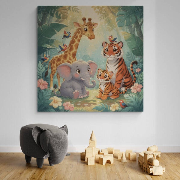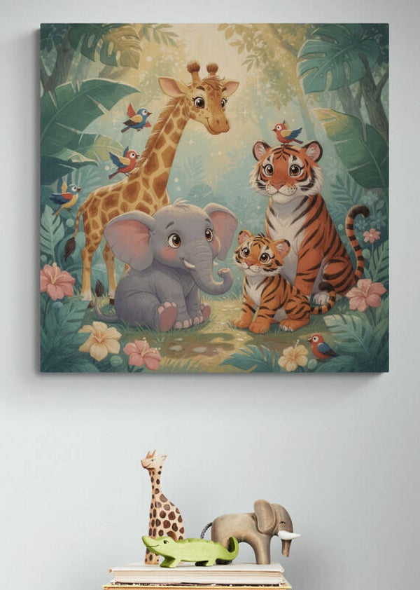 Een vrolijk en warm kinderkamer schilderij met een lieve giraf, een schattige babyolifant en een trotse tijger met welpje samen in een zachte jungleomgeving. Kleine vogeltjes vliegen speels om hen heen terwijl het licht tussen de bladeren doorvalt. De zachte uitstraling en vriendelijke dieren maken dit kunstwerk perfect voor een gezellige en dromerige kinderkamer waar fantasie en natuur samenkomen.