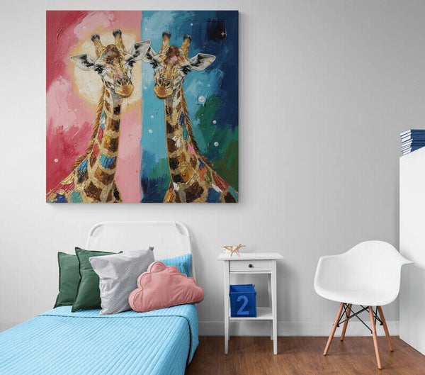 Een vrolijk en stijlvol schilderij met twee elegante giraffen in een moderne, kleurrijke compositie. De achtergrond is verdeeld in warme en koele tinten waardoor het kunstwerk een speels maar ook rustig evenwicht krijgt. De verfijnde goudlook accenten en het paletmes-effect geven het werk een luxe uitstraling. Perfect als opvallende wanddecoratie voor een kinderkamer of tienerkamer.