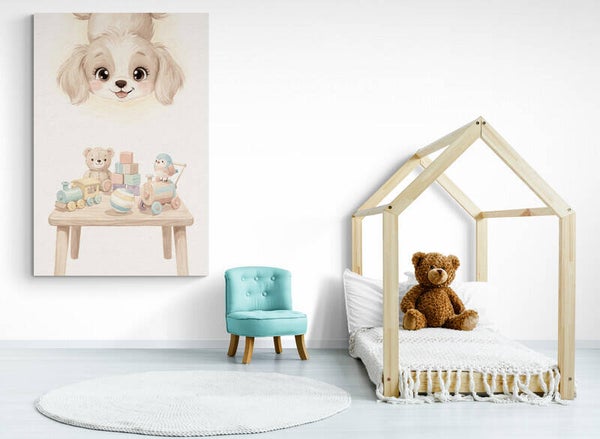 Een warm en nostalgisch kunstwerk waarin een lieve puppy van bovenaf meekijkt naar een tafeltje vol klassiek houten speelgoed. De zachte pastelkleuren en de handgeschilderde uitstraling geven rust en geborgenheid, perfect voor een babykamer of kinderkamer met een dromerige sfeer.
